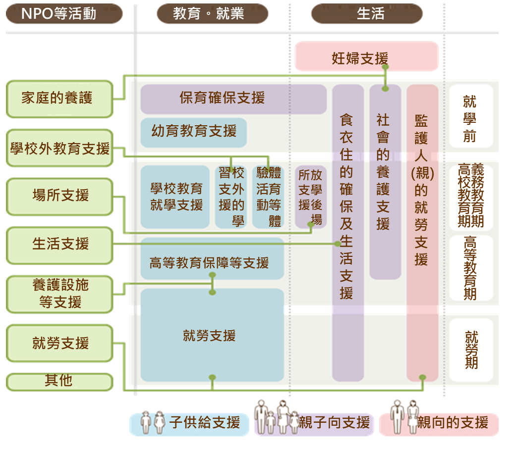 於是擴大之前的作法,除了有非營利組織(NPO)提供家庭養護、生活、課外教育及場所等支援活動外,對兒童、家庭、監護人分別提供相關支援作法,像是為扶養人(指監護人,稱為親)規劃多元化工時的工作型態,以及易返職場的育嬰留停相關就業與勞動措施,另支援弱勢家庭或單親家庭在保育、養護等支援,讓教育、就業及生活無慮,讓受扶養人可以能透過外界奧援,在不同階段皆可安心學習。其主要支援方式如圖2所示,分為就學前、義務教育至高校教育、高等教育以及就業期等階段,設定在2020年前,推動包括3到5歲幼兒就讀免費、低收入家庭有0到2歲幼兒相關費用免費,及大學等高等教育亦有部分減免等措施,以達到“全世代型”社會福利制度的目標。其主要作法如下: