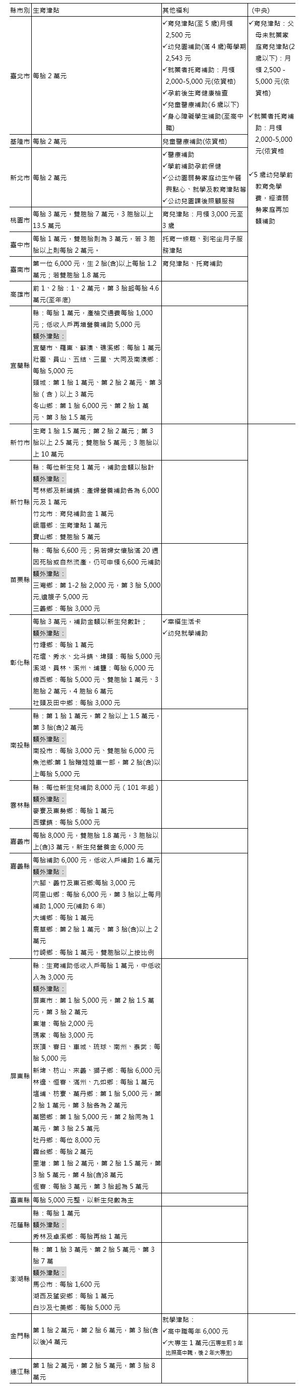 在直轄市及地方縣市政府方面,如表1所示,主要提供6歲以下兒童福利,包括出生時提供生育津貼或產婦幼兒營養補助等,再依各別財政收支情形提供醫療、幼兒園補助或課後照顧服務等福利,有部分的鄉鎮(市)也加碼給予額外津貼,如台北市再加碼滿4歲幼兒入園補助、台中市則提供到宅坐月子服務津貼等,金門縣更針對高中職、大學及五專生等提供就學津貼。