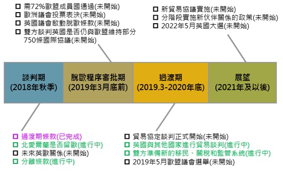 英國政府已於2017年3月正式啟動脫歐程序,展開2年談判,截至目前,談判已經過了一年,依據英國脫歐協議(Withdrawal Agreement)談判進展,雙方已就過渡期(2019年3月29日起至2020年12月31日止)、公民權利、財務結算等議題達成協議,但如愛爾蘭邊界、地理標示、資料保護、脫歐協議之管理等仍待解決。