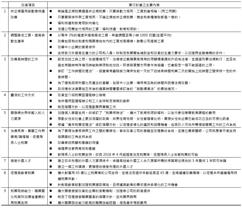 for Working-style Reform),任命加藤勝信(Kato Katsunobu)為大臣,負責推動相關計畫和立法工作,盼能提升日本中長期之經濟成長力。2016年9月,日本成立「勞動型態改革實現會議」,由首相安倍晉三親自擔任議長,他在會議中表示:「這是為改變日本的勞動方式而邁出的歷史性一步。2017年將成為出發點。」歷經十次討論,該會提出九個核心改革項目和推動策略,於2017年3月開始編制「勞動方式改革實行計畫」,政府的目標是從2019年開始實現,改革項目詳如表1所示。