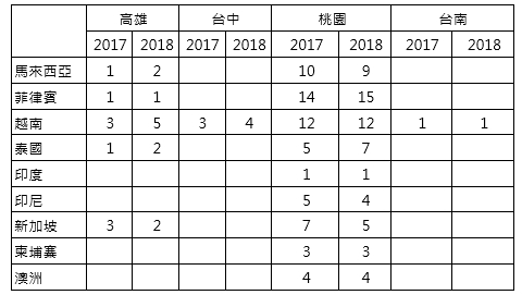 根據交通部民航局統計,2016年5月以來,我國對新南向國家新增的國際航線已超過15條,若以今年1-7月我國對新南向國家定期航線共有77條,其中桃國國際機場有60條,占77.9%,高雄國際機場有12條航線,台中及台南等機場僅對越南有定期航班分別為4條及1條航線。若與去年同期相比,桃機減少1條航線及台南機場增加1條定期航線外,高雄及台中機場皆成長約33.3%。高雄的新南向國際定期航線,包括對馬來西亞、菲律賓、越南、泰國及新加坡等,其中又以對越南航線最多。近幾年我國對越南經貿往來增加,包括我國對越南的投資額僅次於新加坡,再加上來台外籍勞動者及配偶[註1]等人數約占,致近來我國各機場對越南航班航線有增加的趨勢。