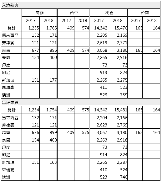 在今年前7個月入出境航班方面,對新南向國家的定期入出境航班皆較去年同期增加超過1,800班次,成長約11%,其中以高雄機場入出境航班成長最高,分別達42.9%及42.1%,主要係因增加1條泰國航線使得入出境班機的架次皆成長一倍半,對馬來西亞及越南也因航線增加而成長超過三成;台中機場則因增加1條越南航線而成長約四成;而桃園國際機場入出境架次除印度航線的班次不變,對馬國部分航線移至高雄機場,致航班架次較去年同期出現衰退外,其餘對新南向國家的航班皆有成長,其中又以新增2條泰國航線而增加651架次的航班最多。