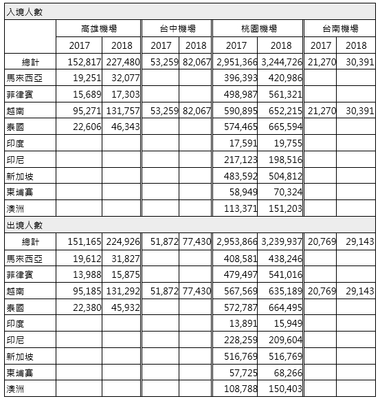 根據交通部民航局統計,今年1-7月新南向國家入出境定期航班旅客皆較去年同期成長12.9%及12.4%。各機場入出境的新南向國家旅客中,台中機場因增加1條越南航線,使得入出境旅客分別成長54%及49%;高雄及台南機場入出境旅客年成長也超過四成,而高雄機場來自泰國及馬國航線的旅客成長最多,分別成長100%及60%,越南旅客亦成長38%;桃園機場新南向航線入出境旅客皆成長10%,其中來自澳洲航線入出境旅客皆成長超過三成最多,其次為柬埔寨及泰國航線入出境旅客皆超過16%。