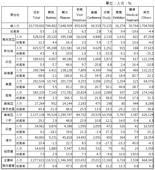 就旅客人次表現方面,新加坡、馬來西亞以觀光來台人次超過32萬人次,泰國也超過20萬人次;因業務來台以新加坡的4.5萬人次最多、馬來西亞及泰國皆超過萬人;因會議及展覽來台者以馬國、新加坡及菲律賓為主;以醫療旅遊目的來台以馬國、印尼等國居多,皆超過500人次,菲律賓超過450人次;來台求學者以馬國、泰國及越南皆超過2,000人次;因其他目的來台者越南超過17萬人次,菲律賓及印尼皆有超過12萬人次。