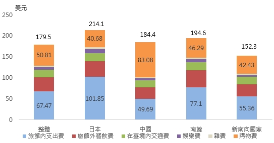 2016年受訪旅客在台平均每人日消費額為179.5美元,其中以日本旅客消費力為最高,平均每人日消費214.1美元,其次依序為南韓(194.6美元)、中國(184.4美元),而新南向國家旅客平均每人日消費為152.3美元