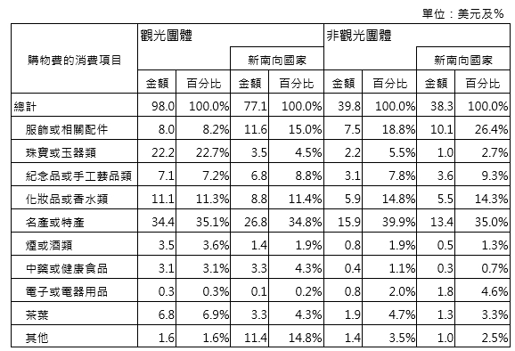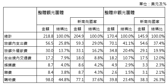 再以觀光及非觀光團體旅客的每人日消費結構來看,如表5所示,整體觀光團體旅客日消費218.8美元,較非觀光團體旅客多支出40多美元,前者有44.8%用於購物(98美元)、25.8%是用在旅館內消費(56.5美元),後者反而在旅館內消費的支出(70.1美元)高於購物(39.8美元),對旅館外餐飲支出較去年成長4.1%;同樣地,新南向國家觀光團體旅客每人日消費204.9美元亦高於非觀光團體旅客(145.9美元),其中前者有37.6%用於購物(77.1美元)、29.0%是在旅館內消費(59.3美元),且購物消費高於日本觀光團旅客(74.1美元);後者不僅旅館內消費支出(54.6美元)高於購物支出(38.3美元),且購物支出金額也較日本(28.4美元)及韓國(35.3美元)等國為高。