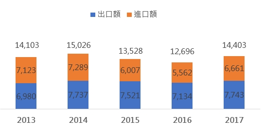 根據中國國家信息中心《「一帶一路」貿易合作大數據報告2018》,如圖ㄧ所示,中國與「一帶一路」國家的進出口總額達到14,403億美元,較2016年同期成長13.4%,高於中國整體外貿成長速度5.9個百分點,占中國進出口貿易總額的36.2%,顯示「一帶一路」國家的重要性越來越高。其中中國對「一帶一路」國家出口7,742億美元,較2016年成長8.5%,占中國總出口額的34.1%;自「一帶一路」國家進口6,660億美元,較2016年成長19.8%,占中國總進口額的39.0%,近五年來進口額成長速度首次超過出口。
