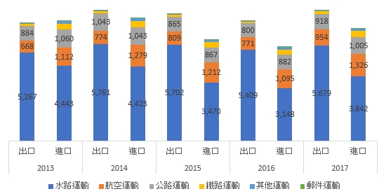從運輸方式來看,如圖二所示,進出口均以水路運輸方式為主,航空運輸與公路運輸為輔,2017年中國對「一帶一路」國家的出口中,以水路運輸的出口額達5,679億美元,占中國對「一帶一路」國家出口額的73.4%,其次為航空運輸(12.3%)、公路運輸(11.9%),近年來鐵路運輸出口及航空運輸進口成長幅度較為明顯。