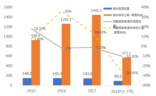 根據中國商務部統計,如圖三所示,2018年1-7月,中國企業在「一帶一路」沿線對55個國家直接投資90.5億美元,較2017同期相比下滑10.3%,占同期中國對外直接投資總額的12.7%,主要投資地區為新加坡、寮國、馬來西亞、印尼、巴基斯坦、越南、泰國和柬埔寨等國家;在對外承包工程方面,中國企業在「一帶一路」沿線的61個國家新簽對外承包工程項目合約2,240份,新簽合約額571.1億美元,占同期中國對外承包工程新簽合約額的45.6%,較2017年同期相比下滑26.9%。