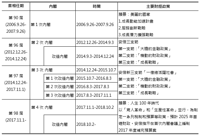 2012年安倍成為日本首位辭職後再度當選的自民黨總裁,並成為第96屆首相,隨著自民黨在國會的優勢而相繼出任97屆及98屆的首相,其相關經貿政策簡要說明如下:
