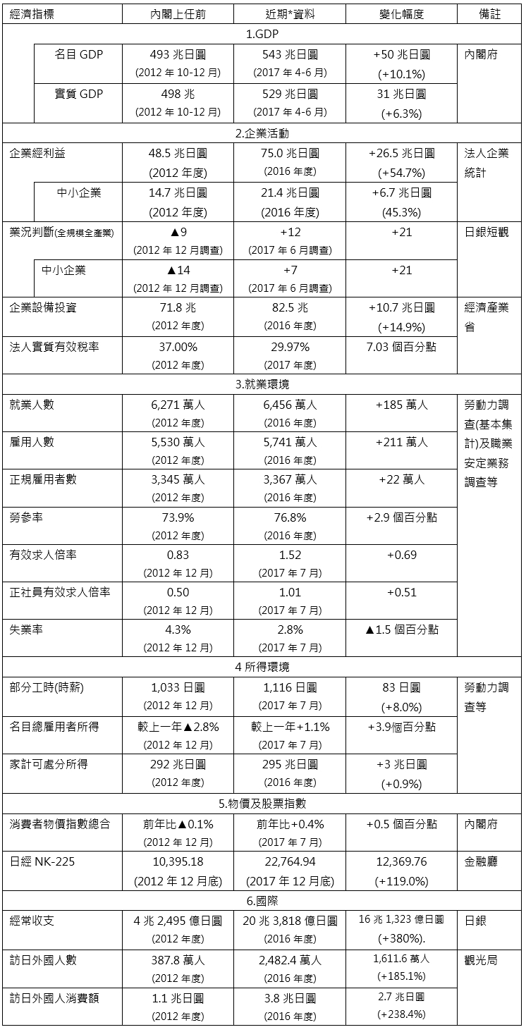 在總合物價方面,由2012年12月的年增率下跌至0.1%,到2017年平均在1%的水準,已擺脫「通貨緊縮」,終於發展到「非通貨緊縮」的局面。日經平均指數由2012年12月底的10,395.18,呈現上升趨勢,到2017年12月來到22,764.94創水準,成長將近119倍,出現1992年1月泡沫期以來的新高。在國際收支方面,也因日圓貶值,讓經常性收支由2012年度的4.25兆日圓來到2016年度已超過20兆日圓,成長近3倍,而訪日旅客人數及消費額也成長將近2倍。