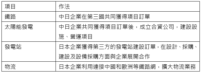 日本在匯總「在第三國的日中民間經濟合作」方針上,日本政府表示考慮在節能環保、提升產業水平、物流等三大領域積極推進中日企業的合作。2018年恢復了中斷七、八年的日中外長互訪、日中高級別經濟對話。因此,5月份李克強總理訪日,雙方同意進一步加強金融等領域合作及設立「一帶一路」官民協議會、推動兩國企業在第三方市場開展合作,如泰國高速鐵路項目的投資合作,其他領域如表3。