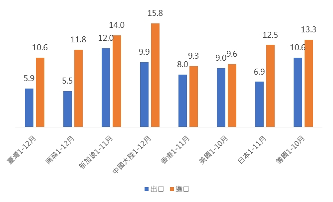 2018年主要國家/地區外貿景氣普遍擴張,如圖1所示,其中新加坡(1-11月)因非電子類產品出口成長,年增12.0%;中國因手機及其零件、積體電路、電腦外銷穩定,出口成長相對較高;德國(1-10月)因機械及醫藥品出口暢旺,年增10.6%;香港、美國、日本增幅介於6.9%~9.0%;南韓受半導體、石油製品出口增加,及船舶輸出減少交互影響,年增5.5%。在進口方面,主要地區受出口引申需求及國際農工原料價格偏高,2018年進口亦呈揚升,其中中國因對原油、積體電路及天然氣需求殷切,進口年增15.8%最高;新加坡、德國、南韓及日本增幅介於