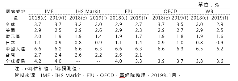資料來源:IMF、IHS Markit、EIU、OECD、臺經院整理,2019年1月