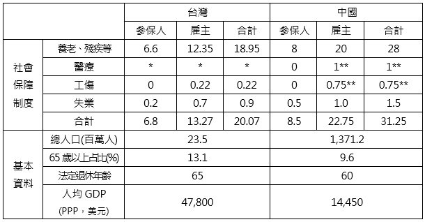 表 4 2016年中國和台灣社會保障計畫受保人及雇主繳費率(%)比較