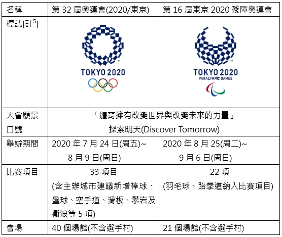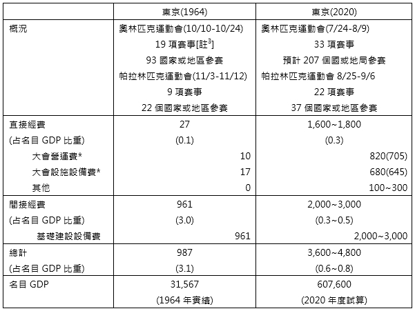 *():內東京(2020)奧林匹克及殘奧競技大會組織委員在2018.12.28公布數據,若加計殘奧預算範圍內。
