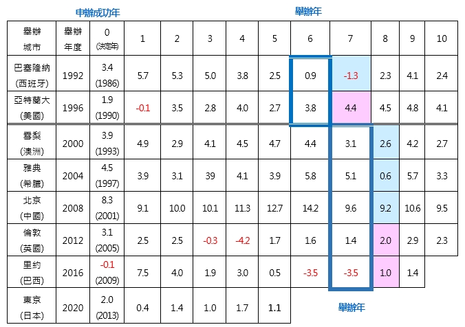 而瑞穗總合研究所(2018)[註9]以1992年以後主辦國在申辦前後的經濟成長觀察,如圖1所示,1992年以來已有7個奧運會主辦國,只有1992年西班牙在奧運會結束後經濟出現了衰退,主要原因係1992年歐洲貨幣危機引發的英鎊崩盤事件,歐盟的主要經濟體共同採行貨幣緊縮政策防止貨幣貶值,整個歐洲經濟不只是西班牙,連帶其他會員國也都出現停滯不前的狀況。其餘屆的主辦國在奧運會結束後,即使有經濟放緩的可能性,實質GDP年增率仍不至於出現負成長,像2000年主辦國澳大利亞(雪梨奧運會)在2001年碰到IT泡沫化、2008年的中國(北京奧運會)因2009年雷曼兄弟倒閉引發金融海嘯等[註10],類似1992年主辦國西班牙,皆是因為世界和地區經濟危機事件的衝擊而導致經濟增速的放緩,無法判定是受到奧運效應波及。因此,瑞穗總合研究所表示即使在2020年東京奧運會結束後,沒有必要擔心日本經濟將不可避免地退縮或放緩。