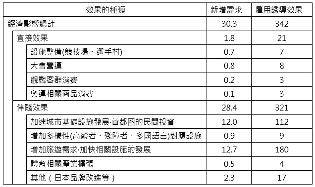 由於2020東奧大會願景主打「體育擁有改變世界與改變未來的力量」作為宣傳口號,提出「所有人都力爭自我突破」、「每個人都相互認可(包容與和諧)」、「連接未來(承上啟下,傳承未來)」理念,不僅要改變體育,還力求在多樣態領域都留下資源與知識傳承給未來,制定「東京2020參與項目」活動,透過”運動與健康、城市建設、可持續性、文化、教育、經濟與技術、重建、向全日本與全世界傳播”等八項主題,由全日本一起行動參與相關活動。像進行一系列的都市規劃,如具濃厚歷史氛圍的江東區重新開發,推動城市無障礙化及軟硬體投資,提升區域的都市機能,進而向全世界展現日本作為高齡化社會領導者,展現出日本在未來社共生社會如何善用技與服務等優勢,或者因應奧運期間湧入大量觀光客、參賽者及各國支持者,如新建和餐廳和飯店、民泊等住宿設施改善,以及5G通信基礎設施發展等,不僅激化奧運會相關大都會區間(東京都、神奈川、千葉及埼玉縣等)在服務、房地產、交通與通信、食品業、批發和零售業、觀光等行業成長。依據瑞穗總合研究估算如表3所示,累計7年間的總體經濟效益將達30.3兆日圓,帶來342萬人次的就業機會。