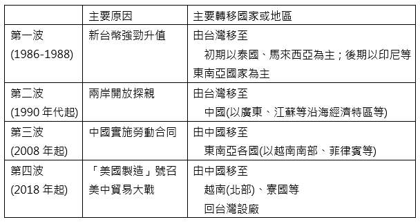 台商主要有四波遷徙潮[註1],如表1所示,第一波外移潮在1986至1988年間,當時國內業者面對1美元兌換新台幣匯率從40元升值到25.5元,在成本壓力下,往低成本的地區移動,雖然中國自1978年宣布改革開放,兩岸政治的對立緊張情勢,台灣企業開始到鄰近的泰國、菲律賓、馬來西亞、印尼等地找尋生產基地。根據投資業務處統計,在1990年以前台商對東南亞投資,首先以馬來西亞與泰國為主,1991-1997年則以印尼為主,而1992年對更低廉勞動力地區越南的投資額超過泰國、菲律賓等地區[註2]。