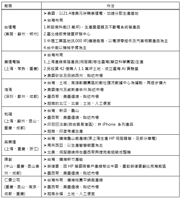 表2 主要電子大廠遷出中國,分散供應鏈策略