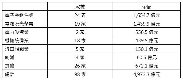 依據統計,截至7月30日為止,經濟部已同意98家廠商回台投資案,如表3所示,總投資金額超過4,973億元,預計可創造的就業人數約近43,500個就業機會。按產業別觀察,以電子零組件業、電腦及光學業投資額及申請家數最多,分別為24家及19家,投資總額超過3,000億元,包括清單中的網通類、隱形眼鏡等消費品廠商受到美國要課以較高關稅,為了保有美國市占率必須將生產基地遷出中國,另一部分如電子關鍵零組件或材料廠則因客戶需求,在考慮風險分散或資安等問題而遷出中國甚至再度回到台灣投資。再從台商回台分布區位來看,聚集北部的桃園、新竹及苗栗合計約占33%最多;其次中部的台中、彰化及南投占27%、南部的雲嘉南及高屏則各占20%及15%。