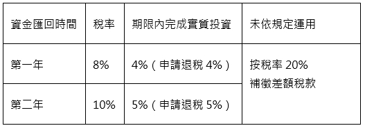 1 、2年分別享有8%及 10%的優惠稅率,若這些資金在未來5年內在台灣進行實質產業投資,稅率還可再減半至4%與5%[註13]。其相關說明如下: