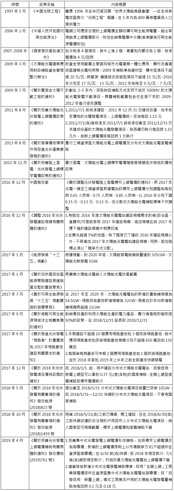 表1 中國政府關於太陽光電產業之主要政策(補貼政策等)