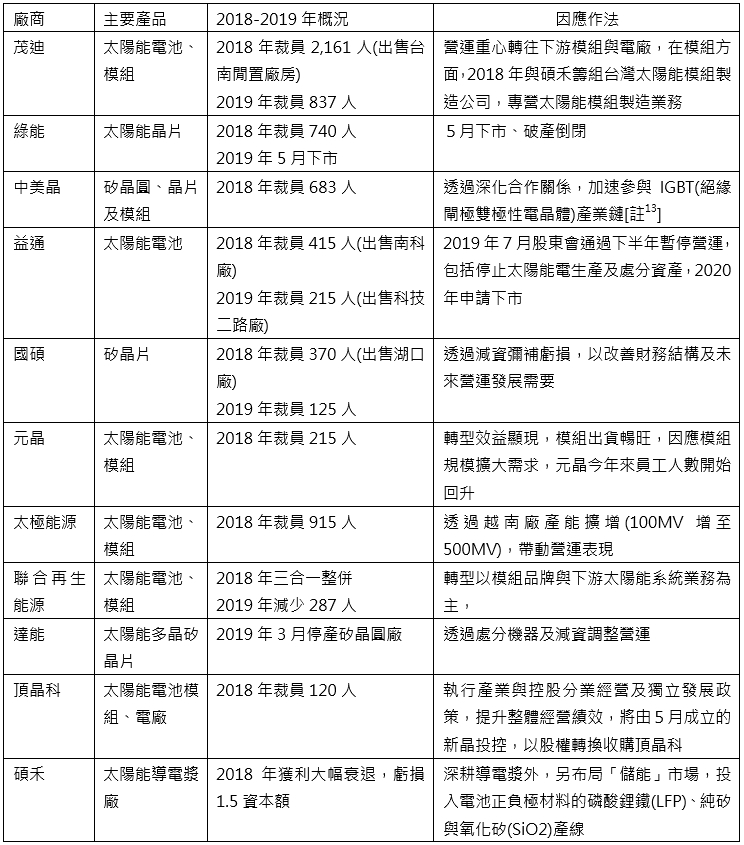 中國「六一新政」大幅度限制太陽能光電系统的補貼規模,導致全球最大消費市場—中國明顯萎縮,不僅中國太陽能廠產生巨幅的虧損而掀起倒閉潮,大量的過剩產能往海外銷售,更造成全球太陽能市場一波低價競爭,加上先前美國201條款、印度防衛性關稅及歐盟解除中國太陽能光電產品的限價限量措施(MIP)等,使得台灣太陽能主力-電池及上游等相關產品面臨嚴峻衰退。2018年6月台廠茂迪率先宣布關閉長晶廠產線,解聘300多名外勞,10月陸續以出售台南閒置廠房及營運策略轉型再度裁員;綠能在9月起陸續裁員,總計減少700多名員工,2019年更因多晶產品被高轉換率且具價格競爭的單晶產品取代需求大減,呈現長期虧損至5月下市、破產;另台廠的新日光、昱晶與昇陽光電自10月起整併更名為聯合再生能源,再進行策略調整,除了營運重心轉往下游模組與電廠,2018年與碩禾籌組台灣太陽能模組製造公司,專營太陽能模組製造業務。因此,光2018年相關太陽能台廠員工減少超過4,400人,如表2所示。