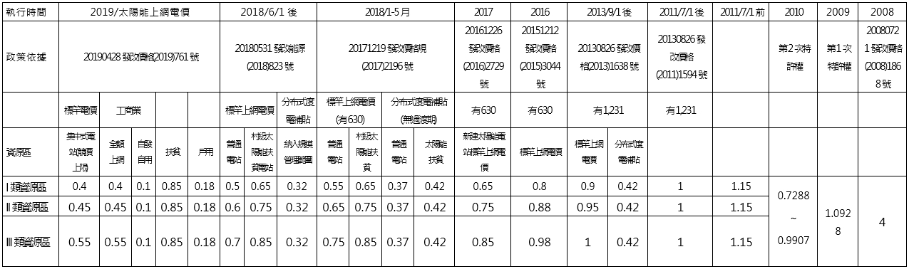 資料來源:新能客(2019.4.30),《【中國光電電價】2008年至今,4元到0.4元每度!九個文件十一次電價》,網址:http://www.pvmeng.com/2019/04/30/5546/。
