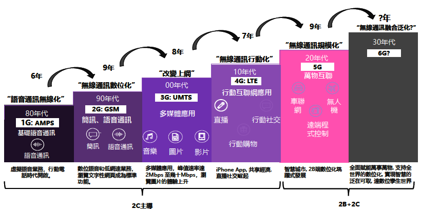 1G)民用手機,打破過去「定點」打電話限制,經過40多年的行動通訊技術發展,2018年5G第一階段標準公布,提供了初階的商業應用部署,不再只有電信行業,還可以應用於金融、醫療、教育、交通等行業,深入到生活的核心,相對的我們日常生活對網路依賴也更加全面性與多元化;2020年7月初公布的5G國際標準技術規範則聚焦在車聯網和工業互聯網等垂直應用,顯示5G技術有助於催生新興的科技應用,隨著應用的成熟化將帶動一波新的競爭優勢。