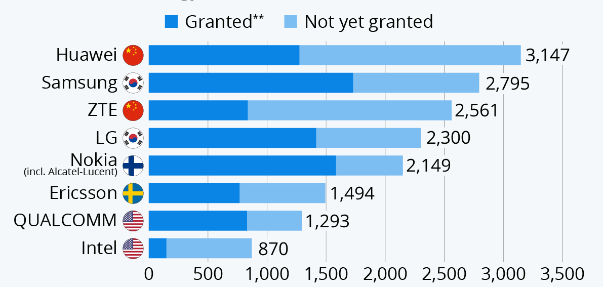 註**:5G專利家族中至少有一項獲得專利授權。資料來源:IPIytics,2020.02