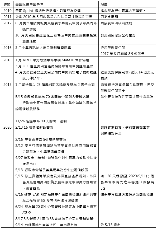 表1 美國對華為、中興通訊等管制措施