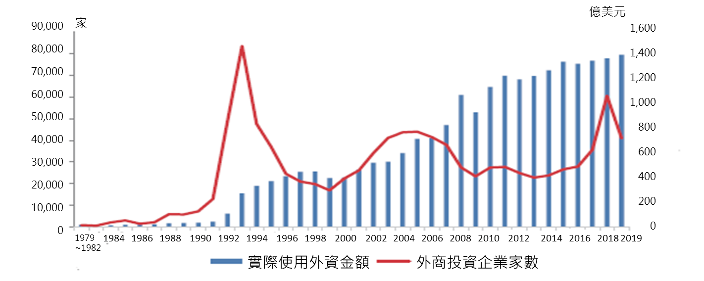 從外資中國歷程如圖1所示,1989年天安門事件後,歐美對中國經濟制裁而減少投資,取得代之的是來自香港及台灣的投資,雖然投資規模較小,但企業設立家數增加快速,尤其香港在1991-1996年期間投資額及家數占比超過5成,台灣投資額也曾超過1成,家數占比超過15%,1994年以後歐美外投資投資增加,1997-1998年的亞洲金融風暴,新加坡及美國資金移入中國增加,2000年中國加入WTO,中國成為世界工廠,外資投資額從407.2億美元,增加至2019年1,412.3億美元,平均年增率13.0%。