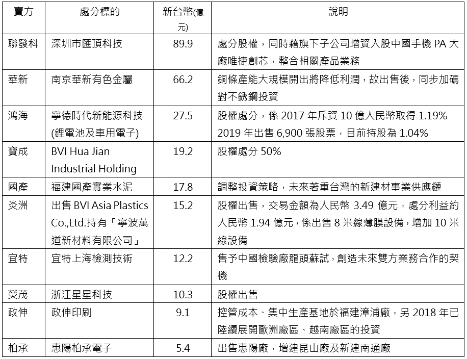 表2 台灣上市櫃公司處分持有的中國公司股權十大案例