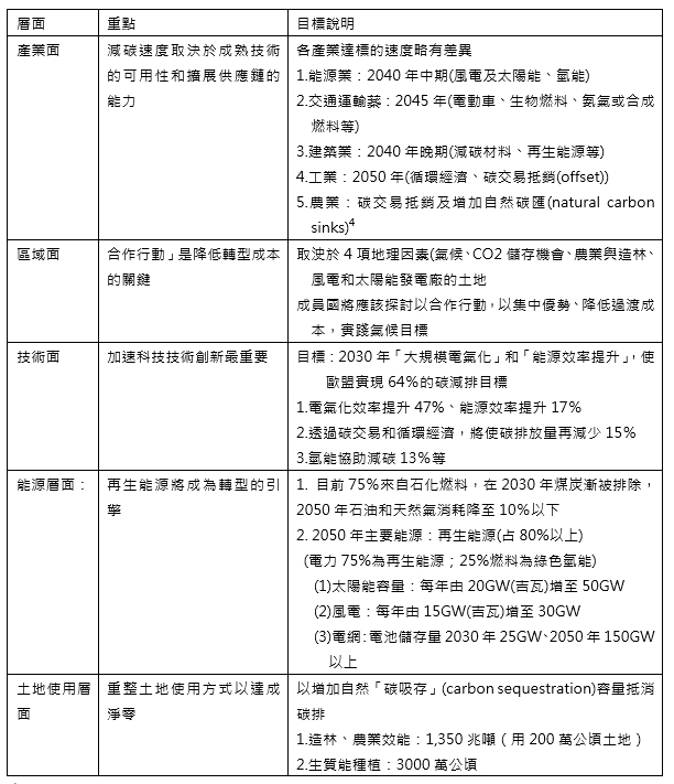 achieve net-zero emissions at net-zero cost)》,建議歐盟應從「產業」、「區域」、「技術」、「能源」和「土地利用」等4個層面,建立一套「最適成本(cost-optimal)」途徑,以達成歐盟實現「淨零排放」目標,如表1所示。
