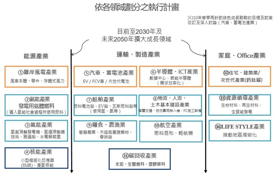 2020年10月日本政府宣布2050年將實現「碳中和」,達到脫碳社會的目標。有於鑑此,經濟產業省(METI)於同年12月25日公布《綠色成長戰略》,這是一項全面的工業政策。促進研發以大大減少日本的溫室氣體排放並引領全球綠色產業。經產省將制定14個成長可期的綠色社會重要目標,依產業區分為三大領域如圖1所示。除了各項領域中也訂定產業發展藍圖,也提出2兆日圓成立綠色基金,支持企業投資綠能科技,日本政府透過政策與資金雙管齊下,藉此刺激民間企業促進綠色產業的技術研發、創新、投資,期能早日實現碳中和目標,並預估2030年能創造90兆日圓、2050年度190兆日圓的經濟效益。