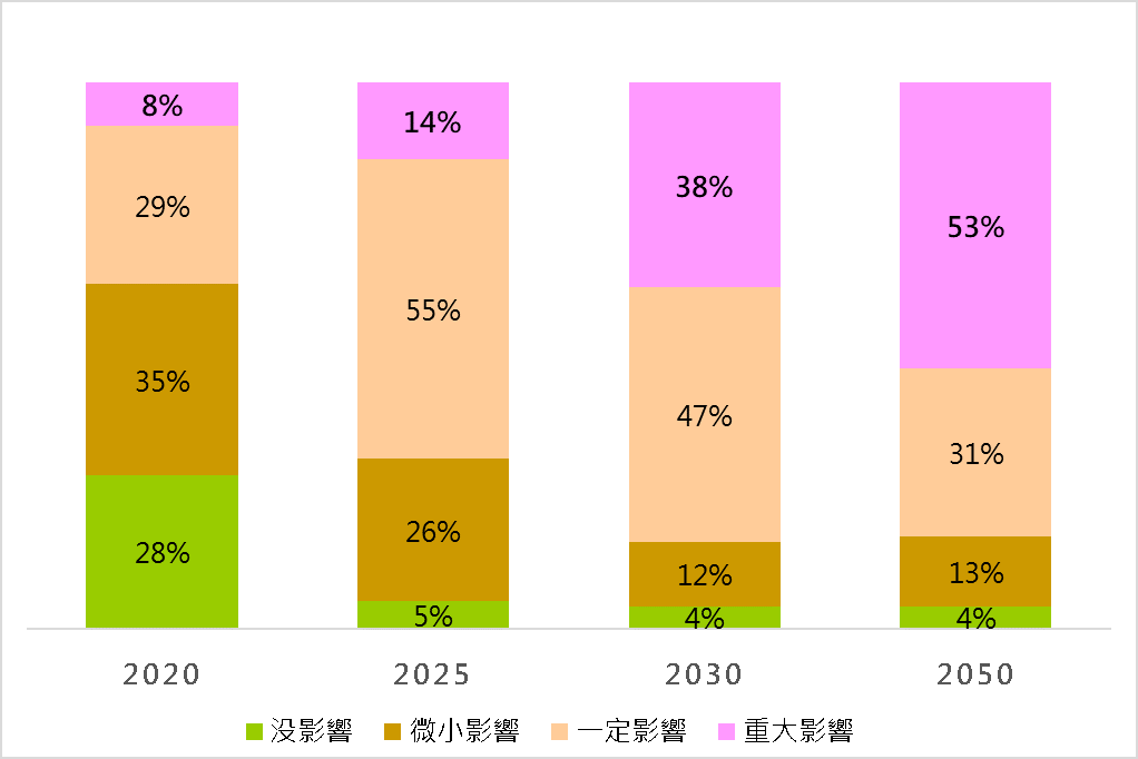 從中國2020年所做的碳交易排放制度調查顯示[註13],如圖2所示,受訪者預估碳排放權交易制度對投資決策的影響將逐漸擴大,2020年有超過1/3受訪者表示投資決策會受到很大或中等程度的影響,認為2025年會影響投資決策則增加至69%,且認為往後的影響將加大。