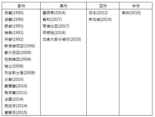 從世界銀行(World BANK)2020全球碳定價現況及趨勢發展報告,如表2所示,截至2020年,全球對碳排放課稅的國家約23個,另外也有部分行政區域實施碳稅,如加拿大的愛華德王子島、西北地區等省份。