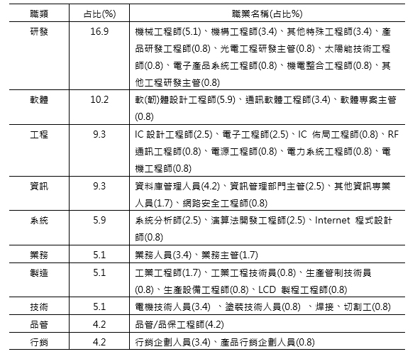 註:占比係指所有產業之欠缺人才職業總數中,該職類/業所占之比率,非指欠缺人數之占比