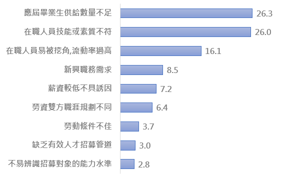 造船、半導體產業材料及調理食品等7項產業;其次為「在職人員技能或素質不符」占26.0%,包含通訊、智慧機械、離岸風力發電、半導體產業 材料、旅行及觀光遊樂等產業;再次之則為「在職人員易被挖角,流動率過高」占16.1%,為太陽光電及設計服務2項產業最主要之人才欠缺原因。