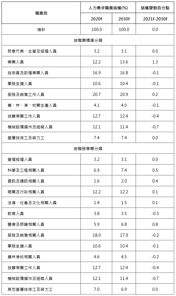 若依職業標準分類觀之,如表2所示,面對各行各業數位轉型需求,未來對於與科技發展相互補的高階技術人力需求漸趨急迫,使專業人員需求明顯擴張,於2030年,專業人員占整體人力的比率將提升至13.6%;相對地,工作性質屬於較具規則性、例行性與重複性的職業,受科技取代的可能性將提高,因而減緩甚至減少相關人力需求,如從事廠房設備與機器操作的機械設備操作及組裝人員,其人力占比將於2030年降為11.4%。