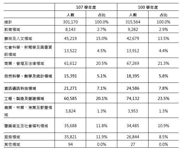 100 學年度11.7萬人( 37.1%)降至 107 學年度9.7萬人( 32.3%),呈現逐年下滑的趨勢,顯示台灣在數位人才供給基礎已逐漸減少,若以先前所提到的台灣超低生育率進行研判,預估到2030年,我國STEM領域人才恐將出現嚴重的斷層。