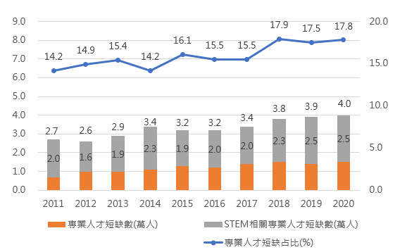 2016年之 3.2 萬人增為 2020年之 4 萬人(以每年8月資料為基準)。2020年專業人才短缺已占全體短缺之 17.8%,主要為資訊科技、科學、統計及工程等