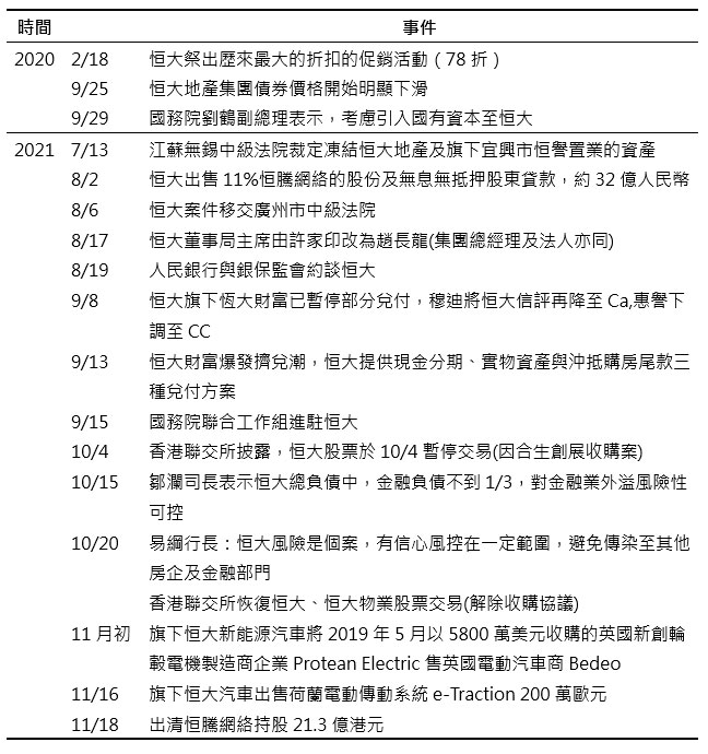 房地產巨頭恒大集團旗下「恆大財富」,於2021年9月14日爆發債務違約,23日再傳出延遲支付價值8,353萬美元的離岸債息,儘管恆大集團於10月21日壓線支付債息,暫時緩解債務違約擔憂。國際三大信評機構,包括穆迪(Moody's)、惠譽(Fitch)與標準普爾(Standard