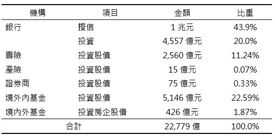 就台灣而言,依據金管會調查,如表3,若以廣義的中國房產企業投資來看,截至2021年9月底,共有219檔基金投資有中國房產企業相關的股票、債券或基金等,金額約426億元,占金融機構對陸企曝險金額的1.87%,顯示恒大事件後的中國房地產市場問題對台灣衝擊有限。