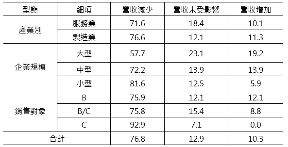 從銷售對象觀察,主要銷售給消費者的企業,因政府防疫管制措施,外出人流大幅縮減下,表達營收減少者高達92.9%,僅7.1%表示未受影響;同時銷售給企業、消費客戶的企業,有75.8%表示營收受疫情影響而減少,15.4%企業表示營收未受影響;以企業客戶為銷售對象的品牌商,有12.1%表示因銷售管道相對穩定,營收因疫情關係反而增加。