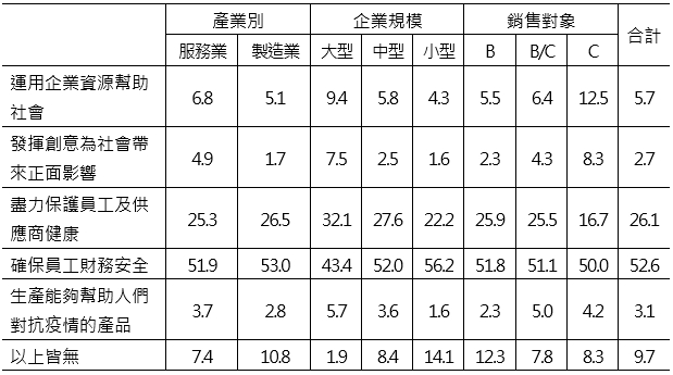 在COVID-19疫情發生後,品牌企業所採行的因應對策,如表2,以「確保員工財物安全」比率最高 ( 52.6%),其次為「盡力保護員工及供應商的健康」( 26.1%)。依企業規模觀察,規模越大越會「運用企業資源來幫助社會」,同時也越會「發揮創意為社會帶來正面影響」以及「盡力保護員工及供應商的健康」;企業規模愈小,因財力人力不足,可做的不多,比較偏向「確保員工財物安全」(比率高於大中型企業),另無採取任何行動的小型企業比率 ( 14.1%),也明顯高於中大型企業。再從銷售對象來看,主要銷售給消費者的企業,在「 運用企業資源幫助社會 」及「 發揮創意為社會帶來正面影響 」比率(分別為12.5%及8.3%)明顯高過銷售對象主要為企業客戶的企業(5.5%及2.3%);銷售給企業者則在「盡力保護員工及供應商健康」比率25.9%最高,及8.3%)明顯高於直接給消費者(16.7%)、同時對企業或消費者(25.5%)。