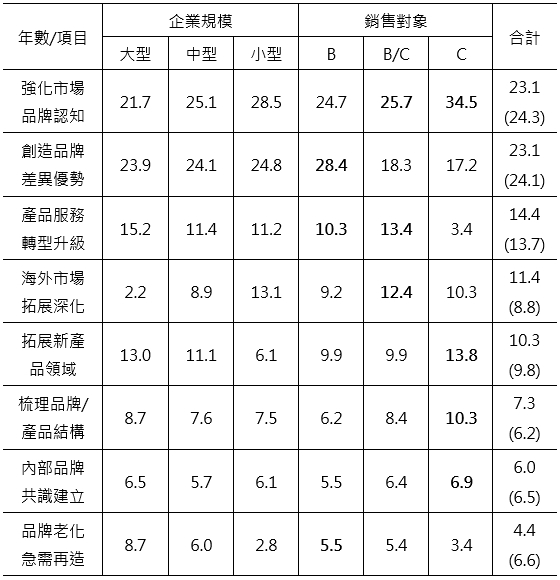 再從銷售對象來看,B2B的品牌企業認為疫情期間,最大的挑戰來自如何「創造品牌的差異優勢」(28.4%),其次為「強化市場對品牌認知」(24.7%),再次為「產品服務轉型升級」(10.3%),而2B品牌商認為「品牌老化急需再造」的比率相對高於2C或2B/2C。B2C的品牌商,為了隨時掌握消費者需求動態,疫情的防疫管制限縮人流活動,導致2C企業面對較以往嚴峻的經營環境,因此認為「強化市場對品牌認知」是首要問題的比率最高,約34.5%,其次依序為「創造品牌的差異優勢」(17.2%)、「拓展新產品領域」(13.8%)、「海外市場拓展深化」與「梳理品牌/產品結構」同等重要。同時有2B及2C的品牌商,也認為防疫期間「強化市場對品牌認知」為首重工作,其次依序為「創造品牌的差異優勢」(18.3%)、「產品服務轉型升級」(13.4%)、「海外市場拓展深化」(12.4%)。