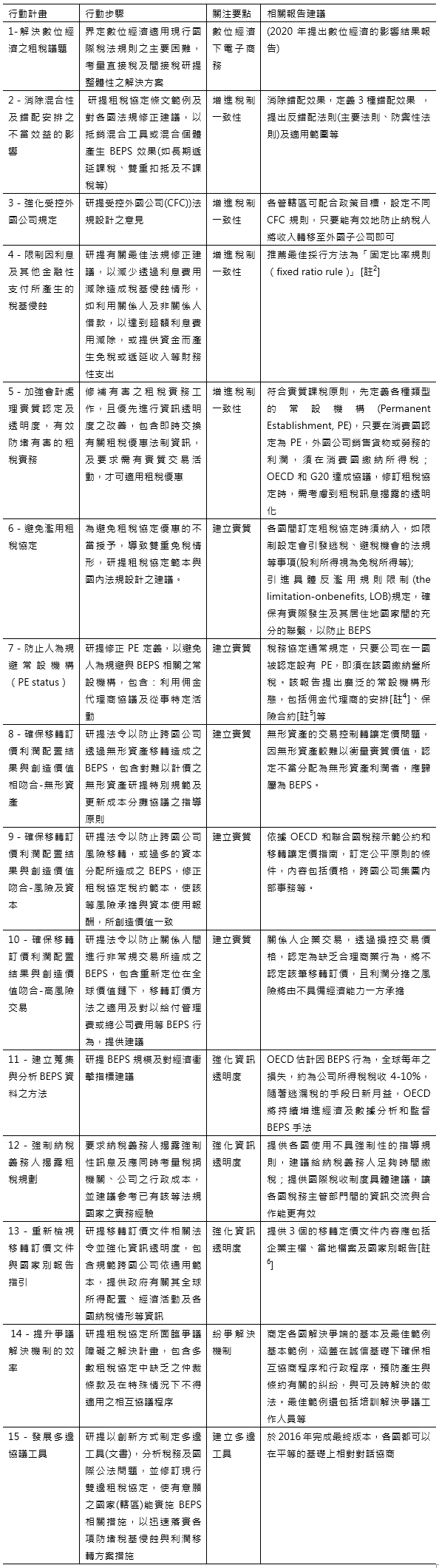 Plan on Base Erosion and Profits Shifting, Action Plan)》提出 15 項行動方案計畫[註2],如表1,透過全面性梳理各種國際租稅缺失,從建立實質(Substance)、增進稅制一致性(Coherence)及租稅訊息透明度(Transparency)、電子商商務、紛爭解決機制及建立多邊工具等議題。