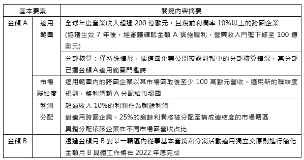 支柱一主要在確保數位經濟活動下,大型跨國公司在各國間能更公平地分配利潤和徵稅權。因此將跨國公司徵稅權從註冊母國重新分配給開展業務活動並賺取利潤的市場,即擴大市場所在地管轄區課稅權。其主要包含三大要素:金額A係指市場所在地管轄區對跨國企業集團(MNE)或該集團分部/單獨業務線的剩餘利潤的新課稅權;金額B係給予市場所在地管轄區內實體進行的某些常規營銷和分銷活動的固定基礎回報,第三是提升數位經濟活動下稅收確定性,包括有效地預防稅收爭端和解決雙重徵稅的稅收管理機制和程序,透過執行工具提高稅收確定性,不管公司是否在當地有實體存在。由於執行金額A的主要工具為多邊協議(MLC),依據2021年10月協議,預計於2022年制定並開放簽署,並於2023年生效。其相關金額A及B的最新內容及範圍如表2所示。